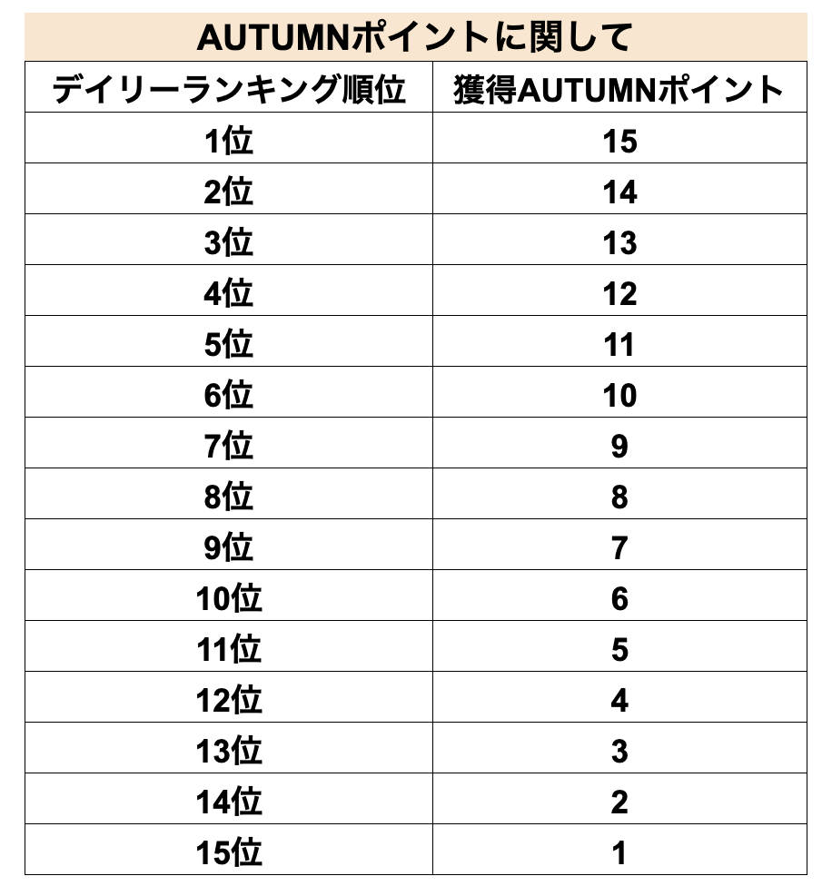 ※デイリーランキング16位以下の場合は、獲得AUTUMN ポイントは0ポイントとなります